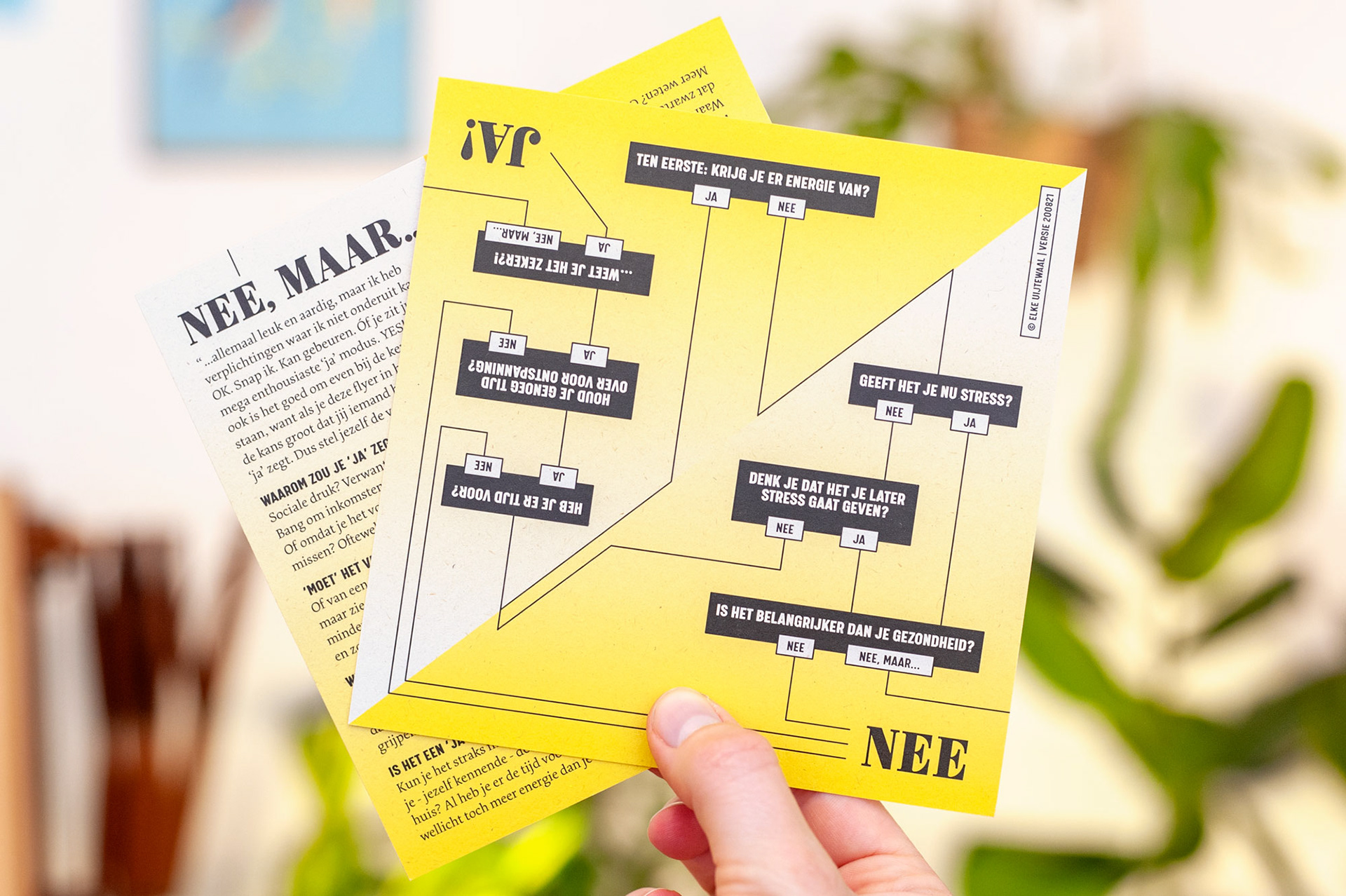 Toen ik onlangs toch weer nietsvermoedend in die 'ja'-val was gestapt, leek het me tijd voor een nieuw project. Eentje die de NEE, de SORRY IK HEB GEEN TIJD en de SORRY IK HEB WEL TIJD MAAR GEWOON GEEN ZIN in het zonnetje zet. Waardoor je straks netjes met een boog om dat zwarte gat heenloopt. En ik hoor graag wat je van dit project vindt.