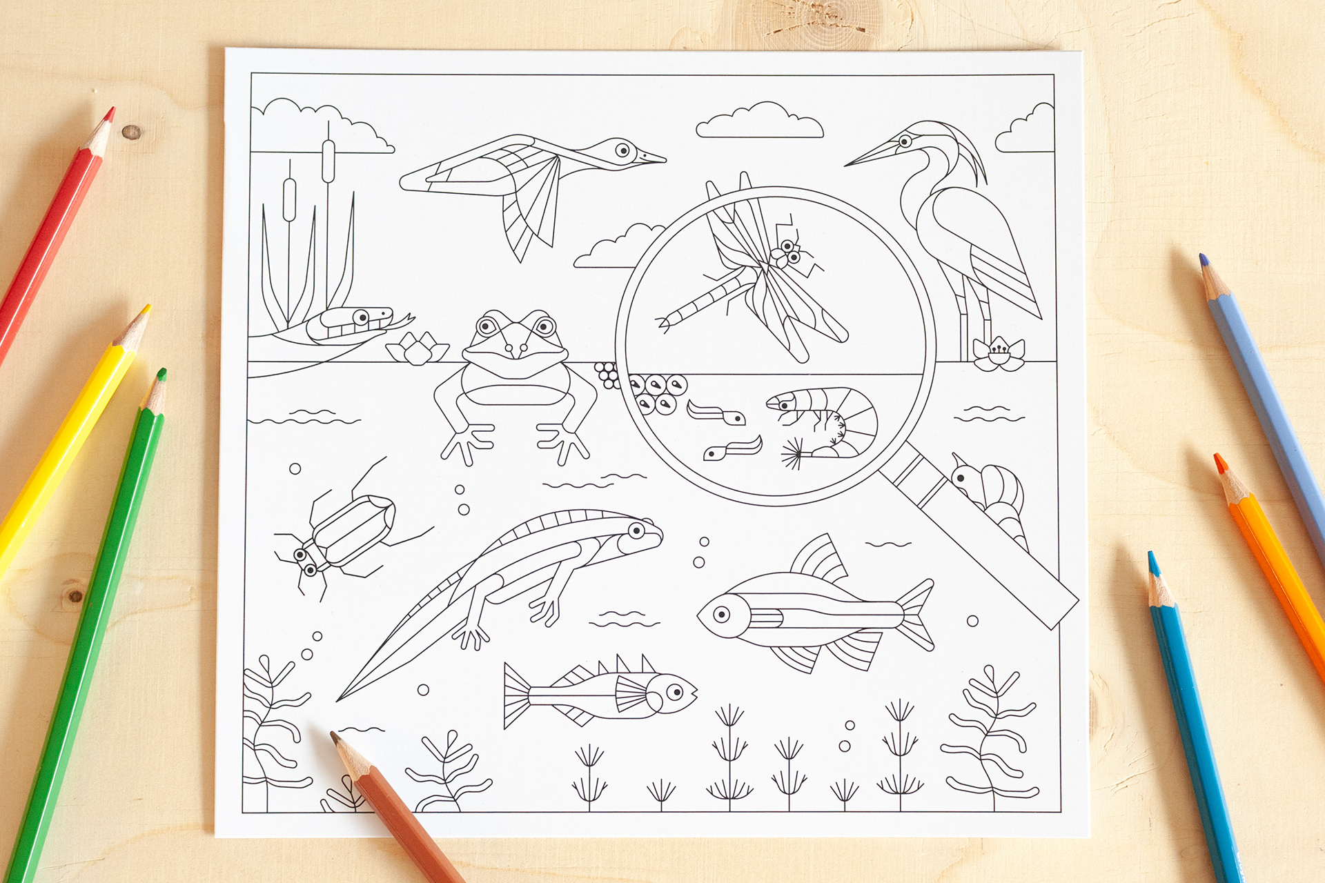 Voor OERRR heb ik twee minimalistische kleurplaten gemaakt. Het zijn vrolijke zoekplaten geworden waarbij beestjes in het bos en in/om het water te vinden zijn. De kleurplaten zijn o.a. toegevoegd aan kleurrijke doeplaten die in diverse bezoekerscentra van Natuurmonumenten te vinden zijn.