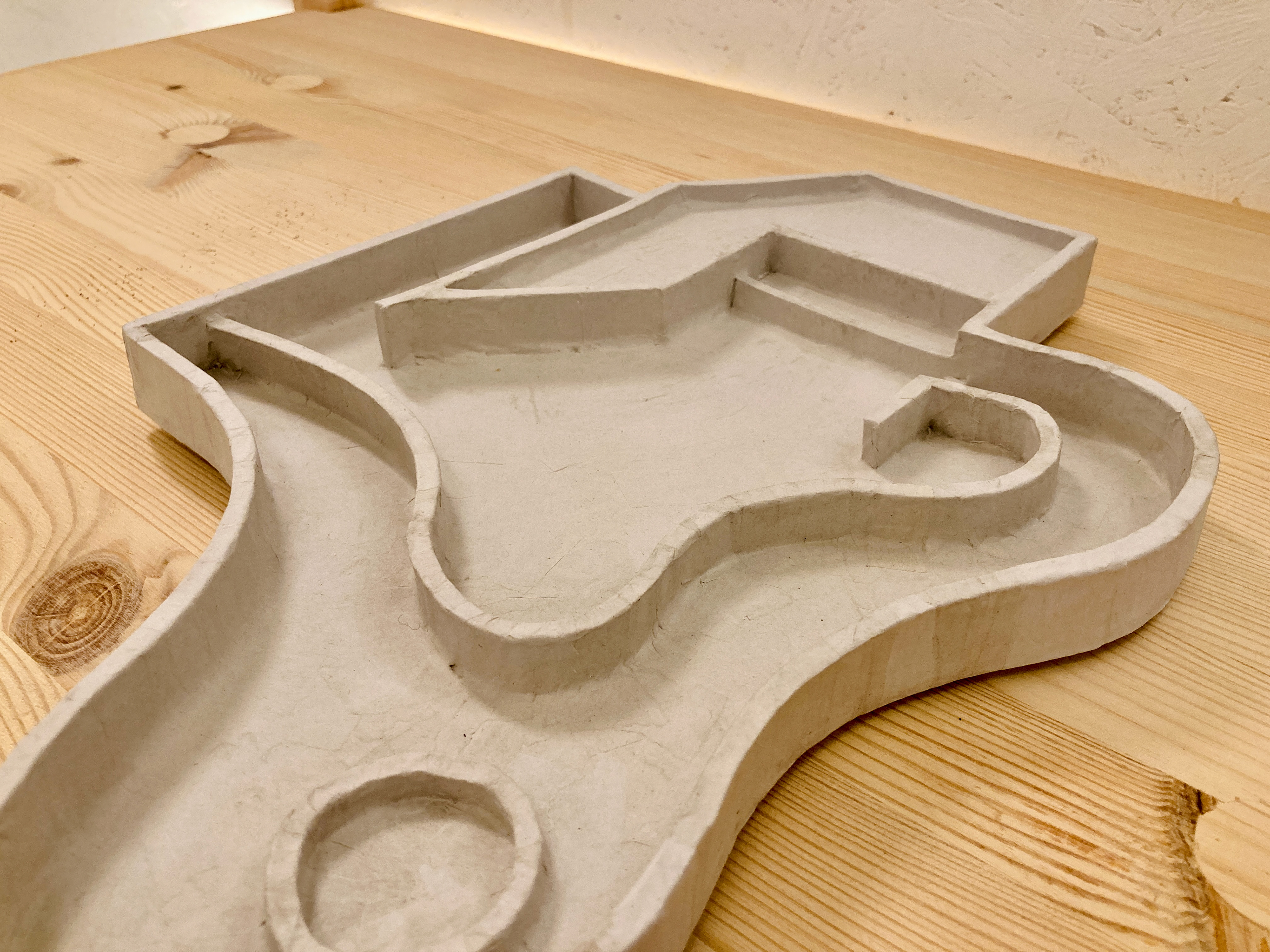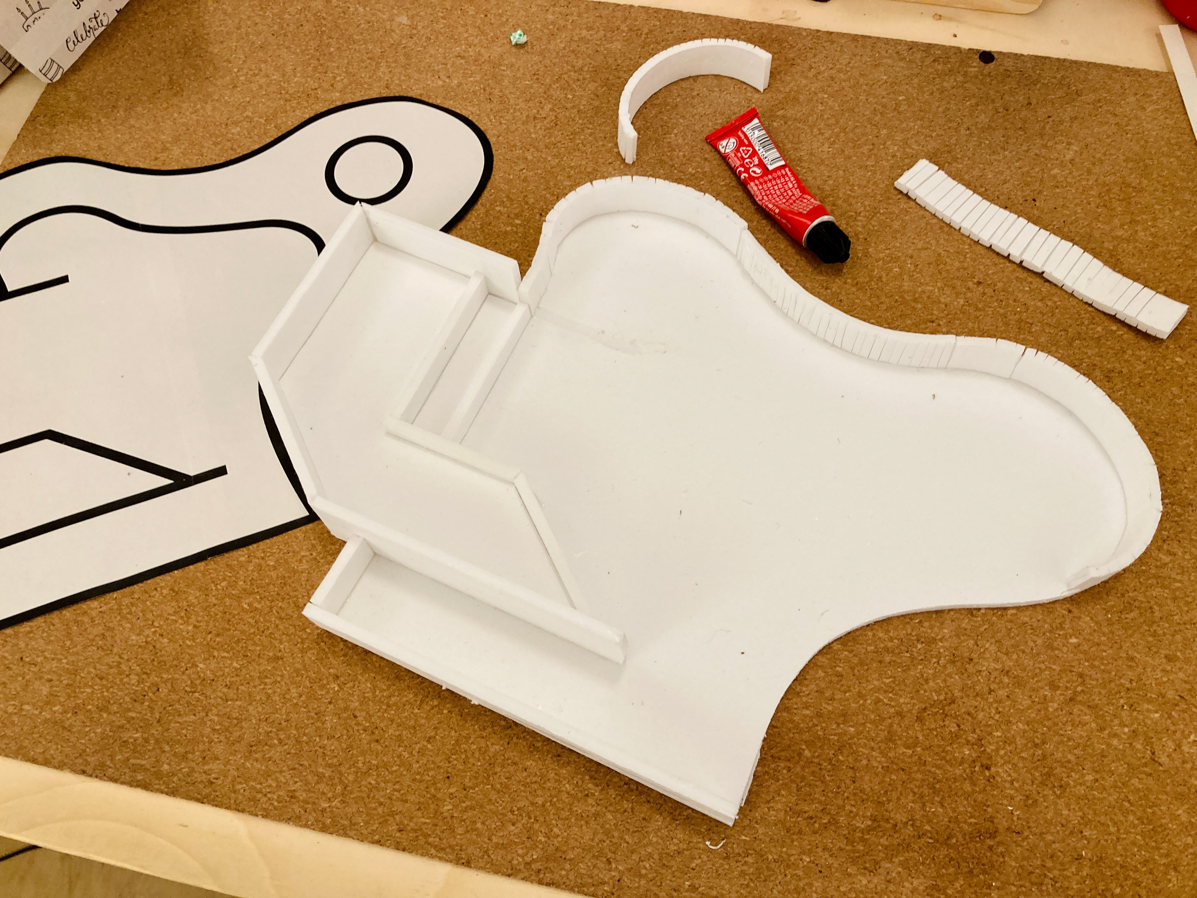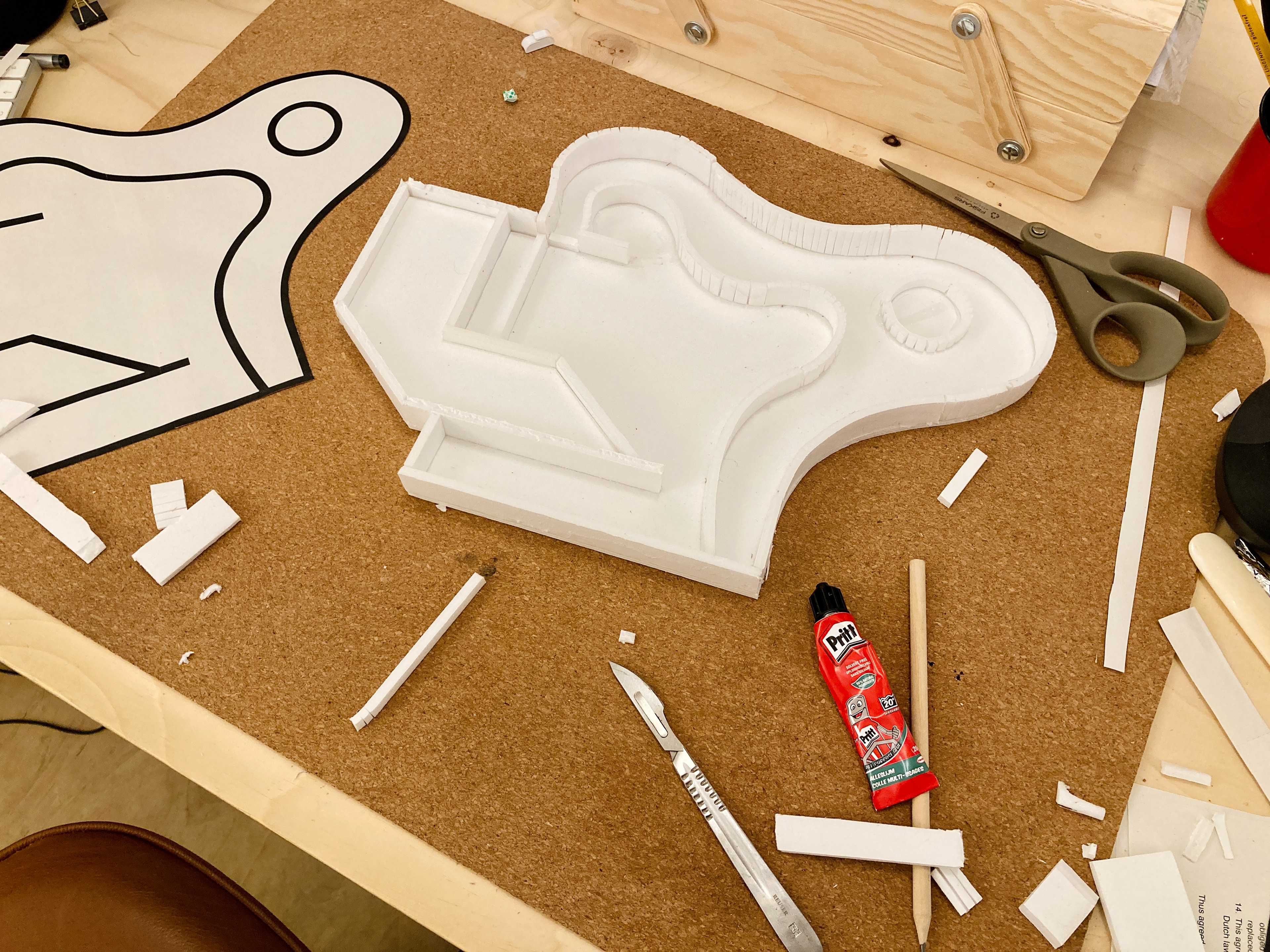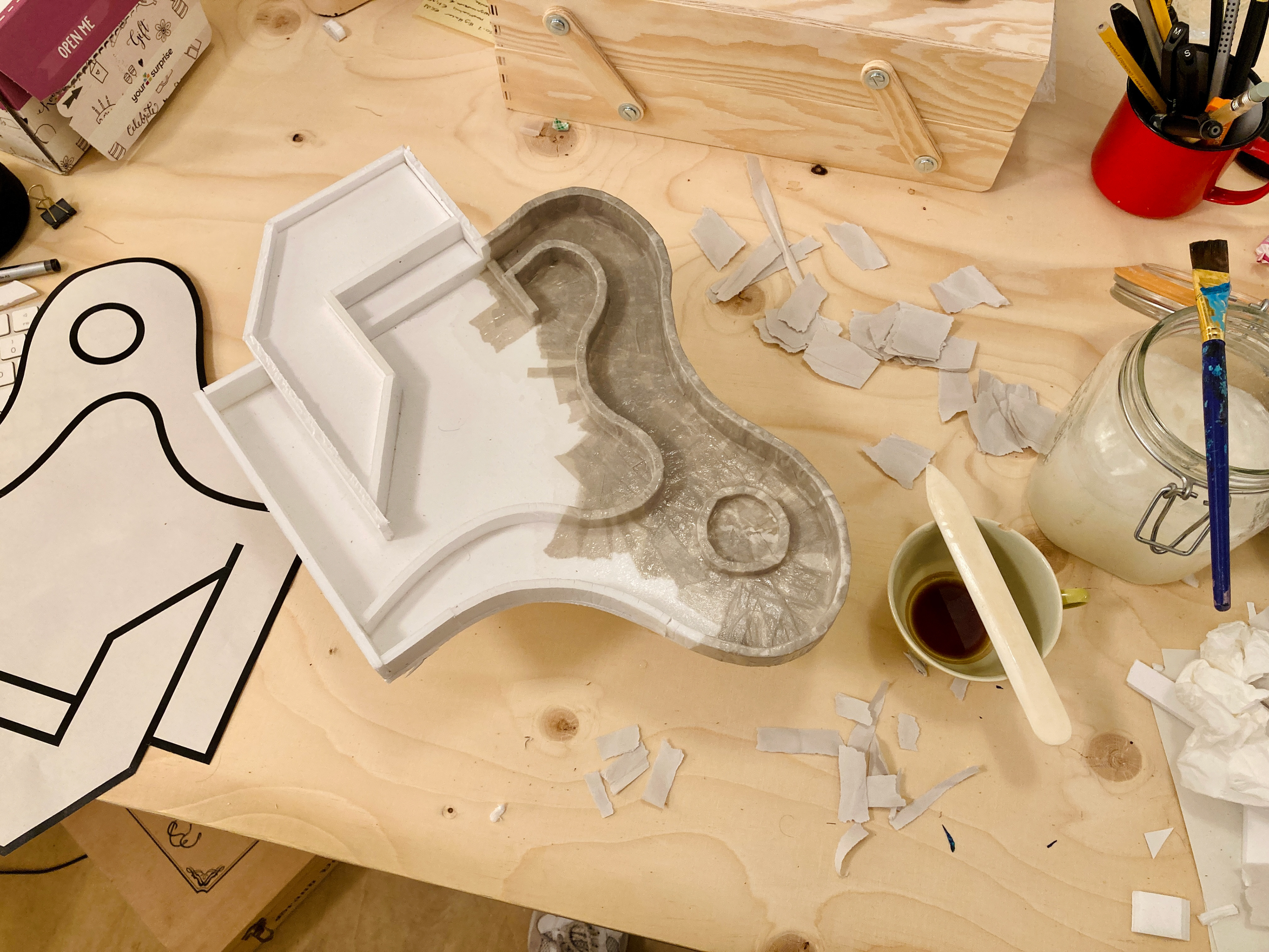 Na een eerste onderzoekende potloodschets maakte ik van restjes oud foamboard het geraamte. Deze beplakte ik met papier-maché tot een egaler geheel. Het werkte niet geheel volgens plan (onbewerkt foamboard trekt duidelijk erg krom) maar het effect werkte zoals ik had gehoopt. Vervolgens heb ik het wit geverfd en afgewerkt met een laag voegenvuller.