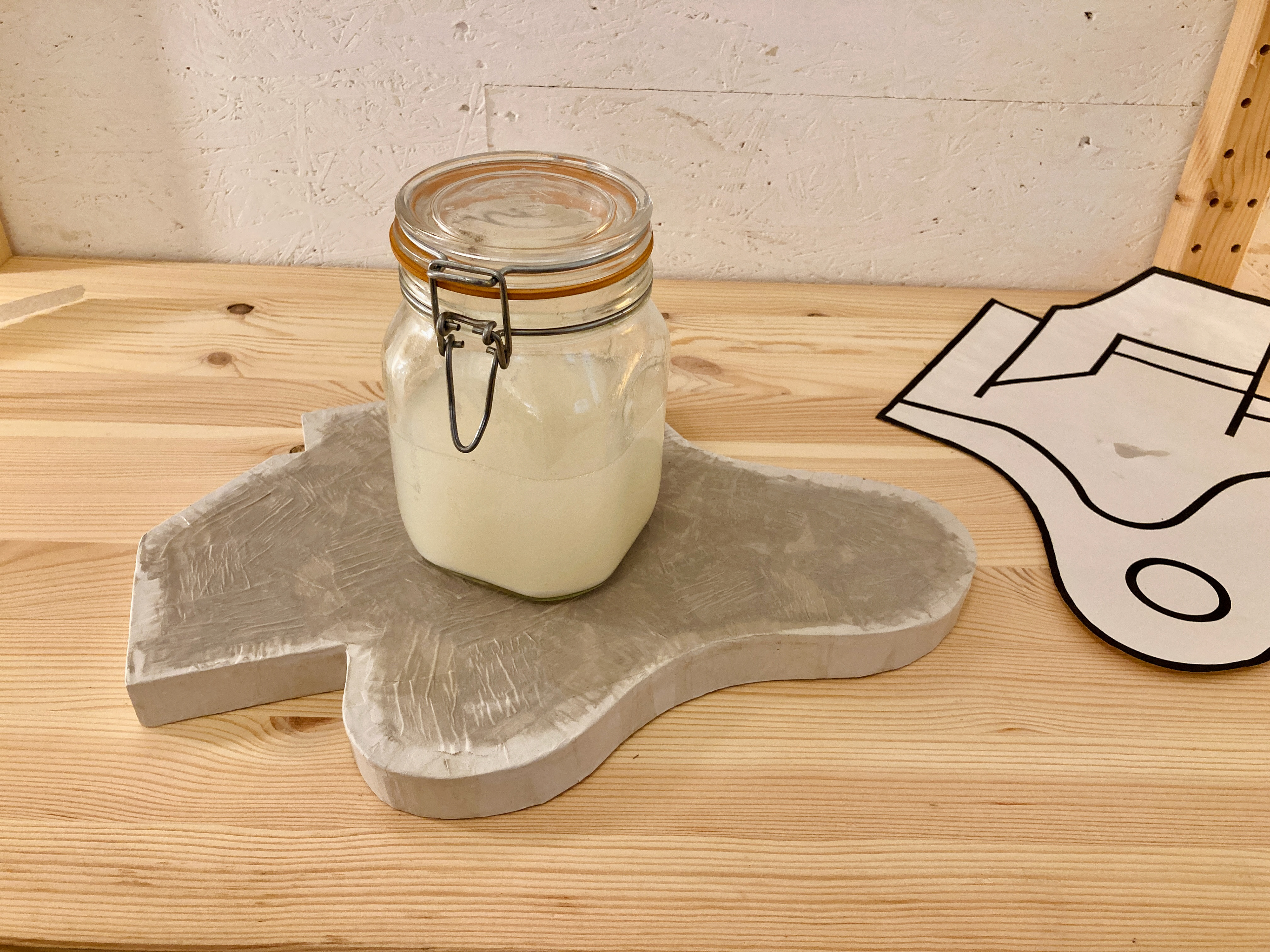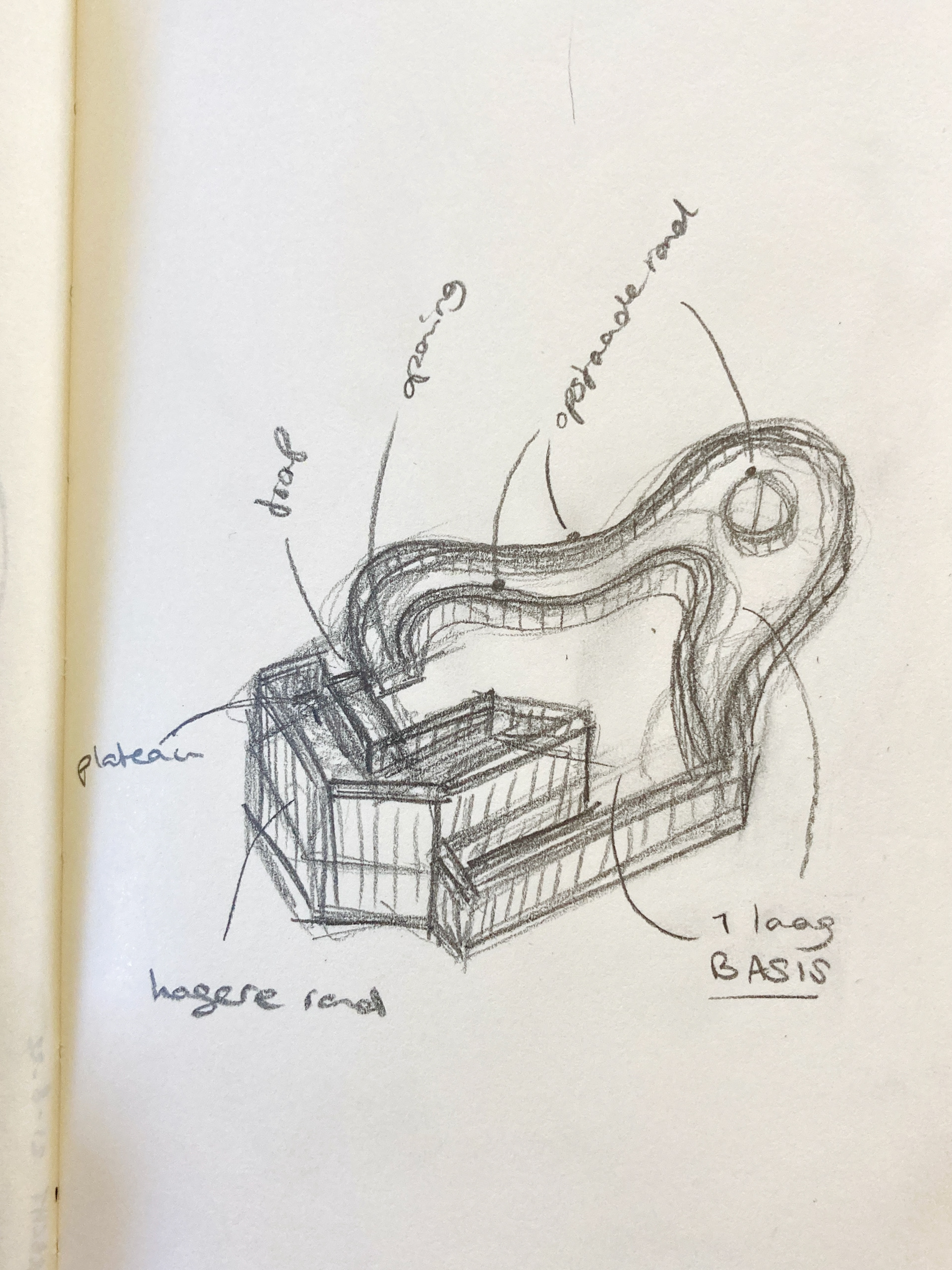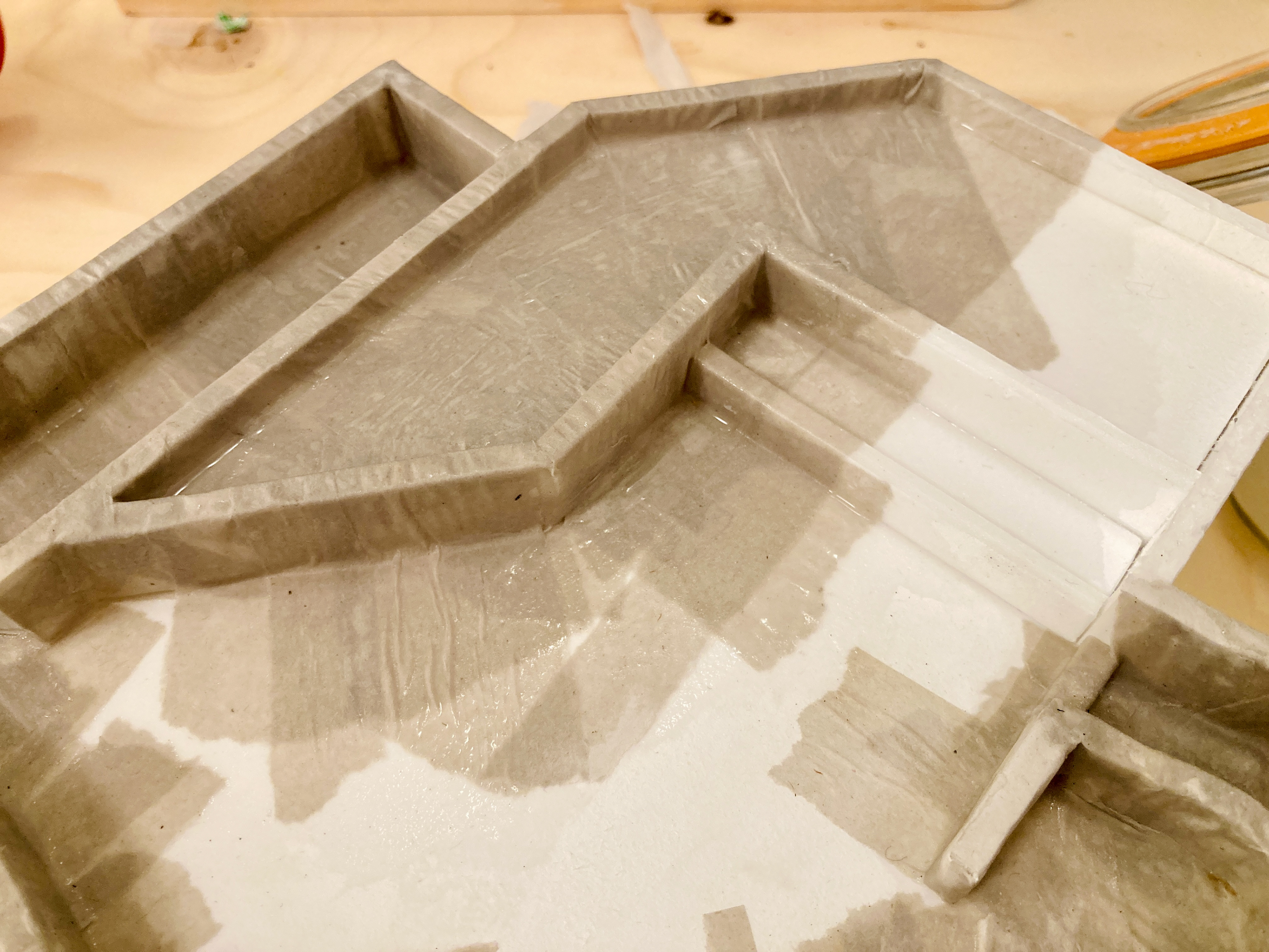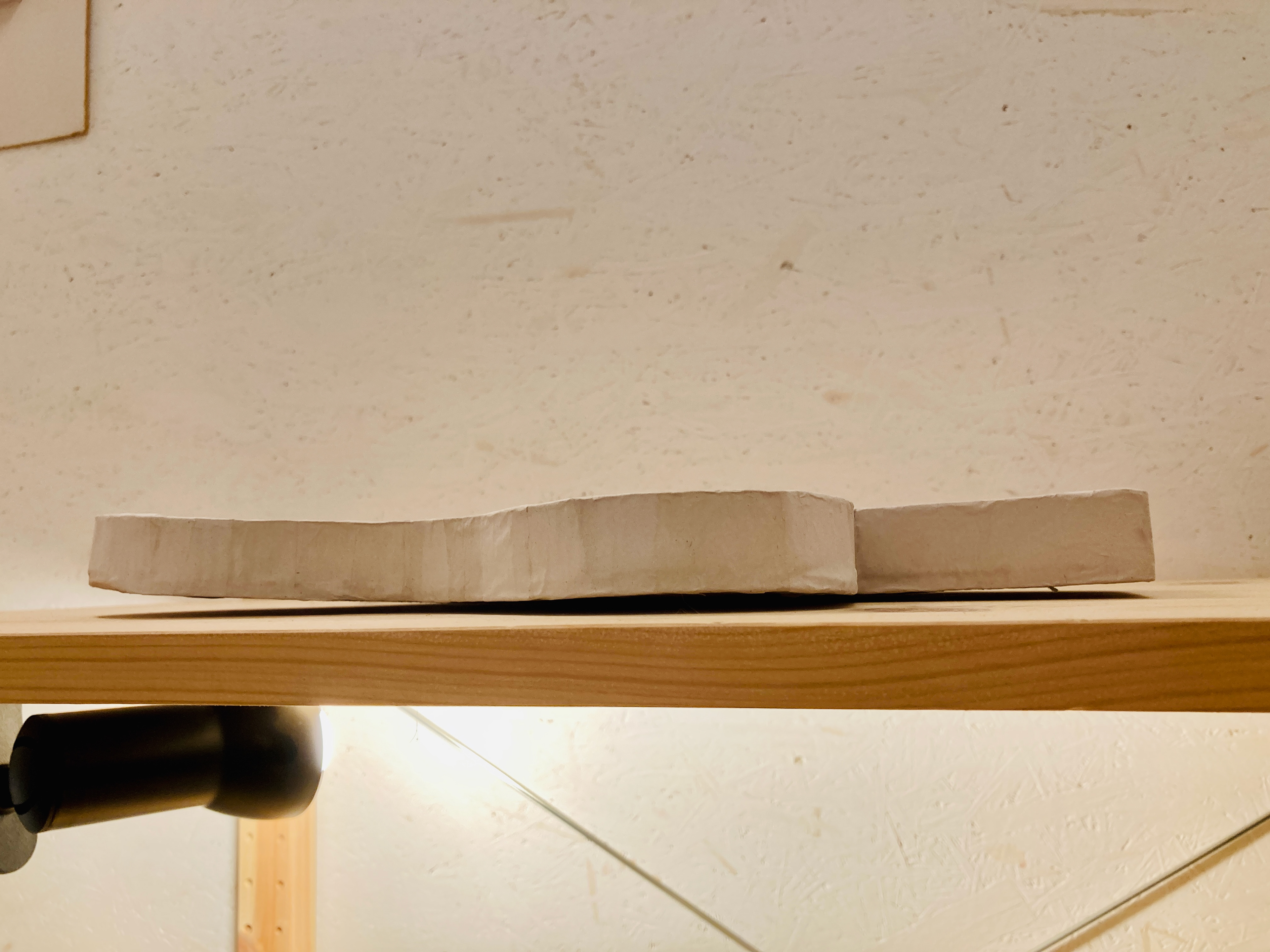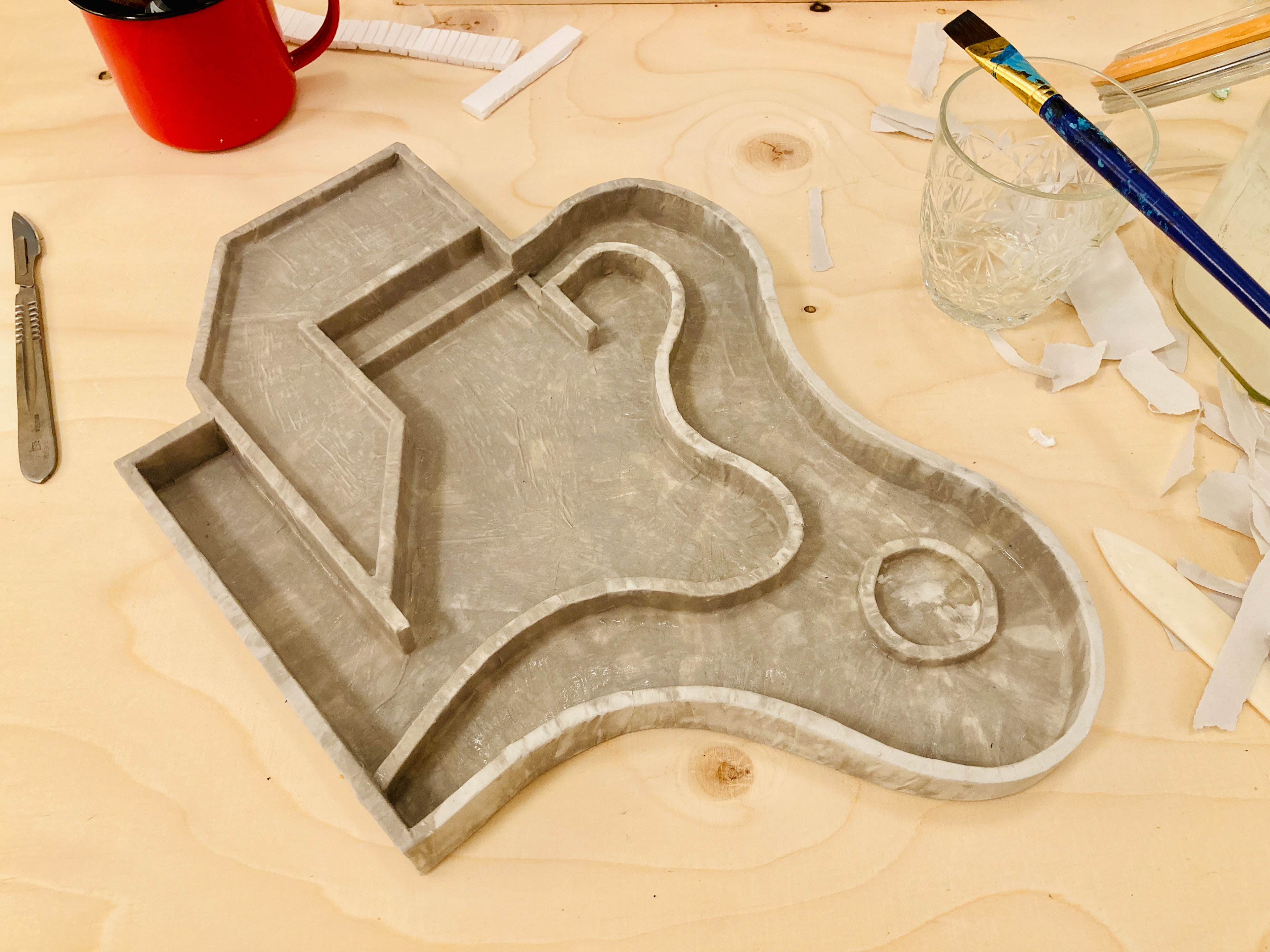 Na een eerste onderzoekende potloodschets maakte ik van restjes oud foamboard het geraamte. Deze beplakte ik met papier-maché tot een egaler geheel. Het werkte niet geheel volgens plan (onbewerkt foamboard trekt duidelijk erg krom) maar het effect werkte zoals ik had gehoopt. Vervolgens heb ik het wit geverfd en afgewerkt met een laag voegenvuller.